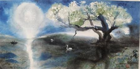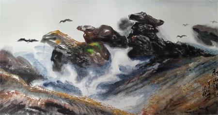 无笔泼墨的创作,强调的是墨色的自然变化,撞击中的瀑泼力,使艺术在创作中达到天人合一的效果,画中有骨,画中有肉,给人一种梦般欣赏感觉。