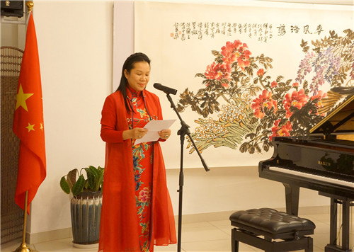 斯洛伐克驻华大使杜尚·贝拉先生;捷克驻华大使佟福德先生;北京鲁公书画文化交流中心、桂林中华文化促进会副主席文燕女士为开幕式致辞。三十多国家的驻华使节及夫人,国家民族画院副院长、中央文史馆书画院研究员郑山麓先生;中国国家画院专职画家、书法篆刻院执行院长李晓军先生;北京美术家协会理事、海淀文联副秘书长、此活动的策划者张驰先生;中国人民大学画院导师、中国美协会员陈中林先生;山东省工笔画学会常务副会长、中国美协会员张世靖先生等百余人受邀出席此次活动。