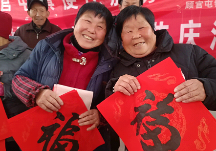 十时许,书法家们已经热情满满的把一幅幅写满祝福的对联铺满了乡村办公室,人们笑逐颜开,兴高采烈的。把火红的福字搂在胸前。(山东省聊城市市直书画家协会)