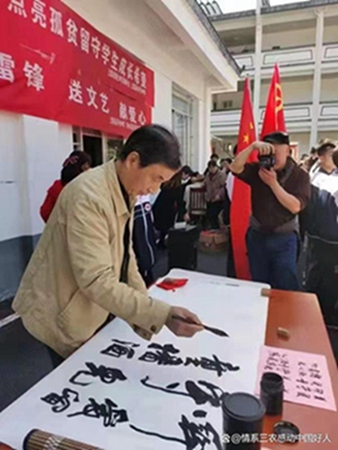 因为喜欢艺术,他永远保持良好的心态,虽然将近八十岁的他,咋看上去也就六十多岁。他喜欢艺术,却没有被名誉所累。他渴望富有,却没有被金钱所困。虽然早已退休,已经不在艺术工作岗位上,但是当地政府号召老艺术家们发扬雷锋精神和风格,去传承下一代。书画创作的百忙之中,他还积极参与当地书画爱好者的学习和培训教育中。他经常勉励正在勤奋读书的青年人,要好好读书,读好书,做社会主义四有新人,做有责任有担当和社会有用的人,建功新时代,戴炳生老师,每天在不忘初心牢记使命,永远跟党走的学习追求中勇攀一个又一个高峰,创造了一个有一个奇迹。(央视编导良杰)