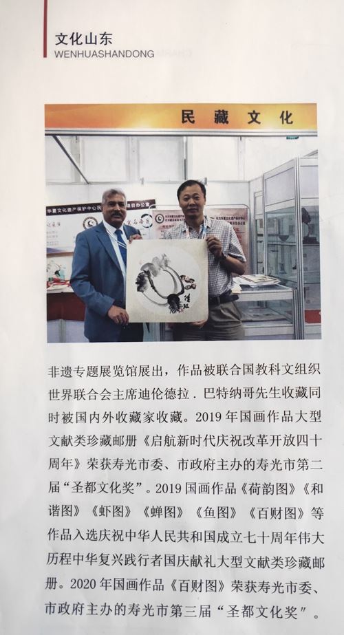 2019年国画作品大型文献类珍藏邮册《启航新时代庆祝改革开放四十周年》荣获寿光市委、市政府主办的寿光市第二届“圣都文化奖”。2019国画作品《荷韵图》《和谐图》《虾图》《蝉图》《鱼图》《百财图》等作品入选庆祝中华人民共和国成立七十周年伟大历程中华复兴践行者国庆献礼大型文献类珍藏邮册。