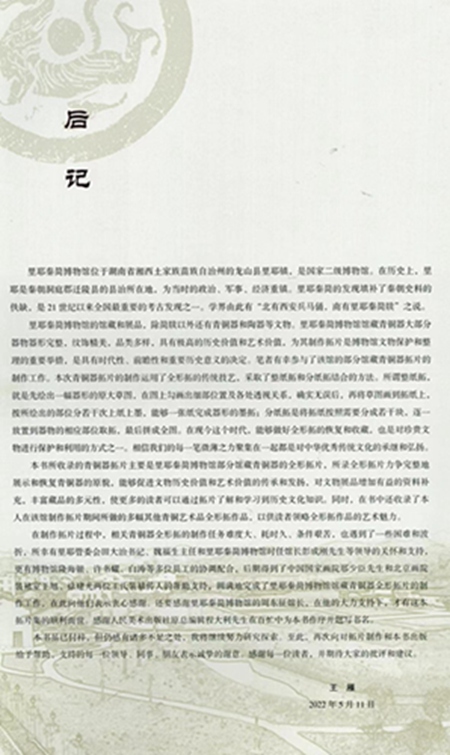 面对新形势和新任务要求,里耶秦简博物馆在出版了《里耶秦简研究论文选集》、《里耶秦简经济文书分类整理与研究》、《里耶秦简博物馆藏秦简》等书之后又推出了由里耶秦简博物馆编王雁著《古铜留墨——里耶秦简博物馆藏青铜器拓片集》。