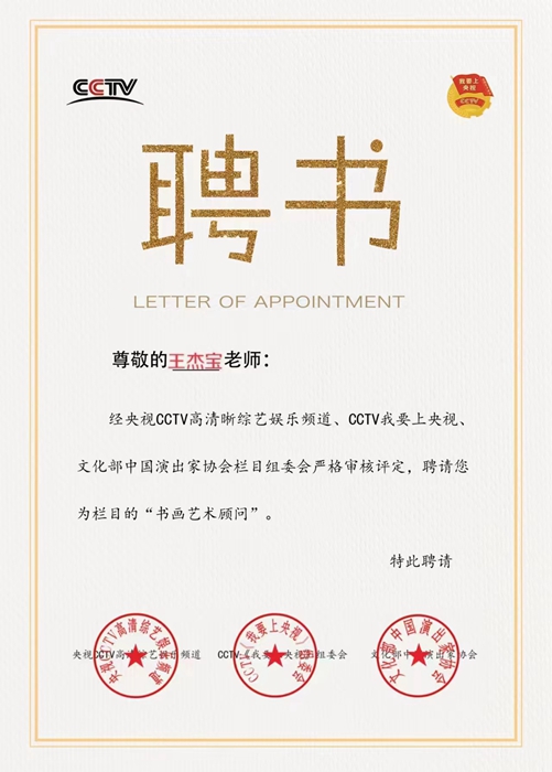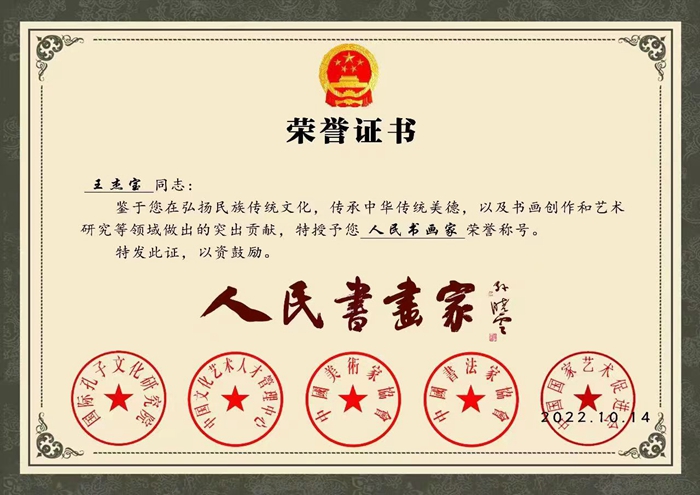 三农电视台山东讯(张原浩 冯爱云) 金秋十月,硕果累累。近日,在全国人民喜庆党的二十大胜利召开之际,著名书法家、羲之文化传承人、国宾礼艺术家王杰宝也是喜报频传、收获满满——在刚刚获得央视CCTV高清综艺娱乐频道、CCTV我要上央视组委会、文化部中国演出家协会栏目组委会联合颁发的“书画艺术顾问”聘书不久,又被国际孔子研究院、中国文化艺术人才管理中心、中国美术家协会、中国书法家协会、中国国家艺术促进会联合授予“人民书画家”荣誉称号。