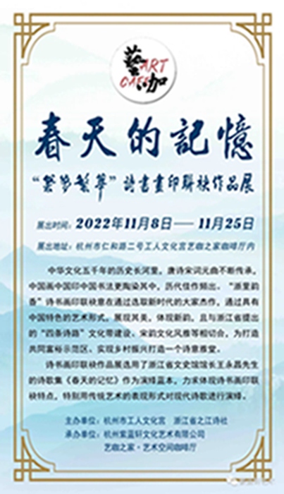 2022年11月8日,春天的记忆——“筑梦繁华”诗书画印联袂作品展在杭州市仁和路二号工人文化宫艺咖之家咖啡厅内开展。