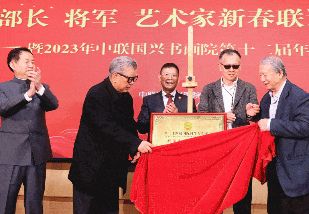 第三十四届国际科学与和平周中国组委会主任胡振民、马文普为“科学和平教育基地”落户中联国兴揭牌。