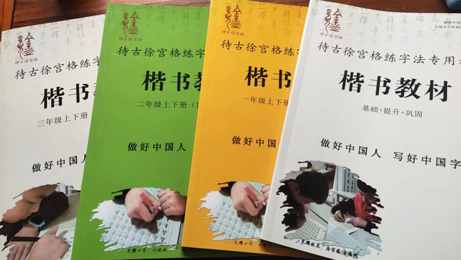 教材上的“做好中国人,写好中国字”特别醒目,作为中书协会员、世界华人书法家协会常务副会长兼秘书长,徐勤民的民族情怀跃然纸上。多年来,徐勤民不仅砥砺书海,提升自我,更是把自己对书法艺术的执着,对祖国汉字普及的追求,融入到学术研究与教学实践中。他研创的待古徐宫格练字法已通过了国家版权局和国家知识产权局审核备案,现已面向全国中小学生推广。徐宫格练字法对每一种基本笔画写法都做了解析,如短“撇”要“点顿笔、斜下行、行笔短、笔锋显”,长“撇”要“点顿笔、向下行、转弯处、斜撇连”,“捺”划要“轻到重、斜下行、转弯处、捺脚显”……一笔一画精妙处,抑扬顿挫汉字情。