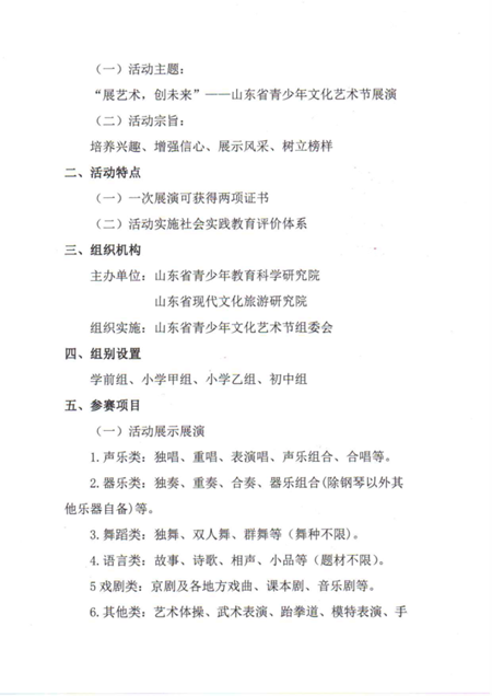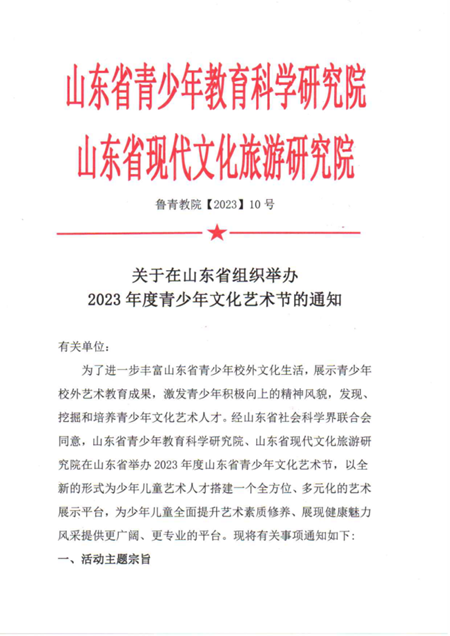 为了进一步丰富山东省青少年学生校外文化生活,展示校外艺术教育成果,活跃中小学生校园文化生活,激发青少年积极向上的精神风貌,发现、挖掘和培养艺术类人才,经山东省社科联审批同意活动备案,山东省青少年教育科学研究院联合山东省现代文化旅游研究院共同举办山东省青少年文化艺术节,以全新的形式为少年儿童艺术人才搭建一个全方位、多元化的艺术展示平台,为少年儿童全面提升艺术素质修养、展现健康魅力风采提供更广阔、更专业的平台。