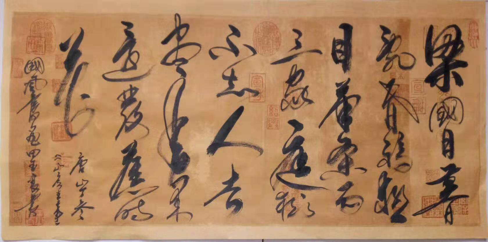 通过勤习不辍、大胆探索,以其天生的悟性和艺术造诣即兴入诗、名字瞬间作诗题字,在习练行草书法的基础上,摸索着创意书画高境界中蕴藏歌的旋律、诗的韵味、画的意境、时代的气息,拓展着他创意书画的欣赏价值、艺术价值和收藏价值,大手笔探索着中国书画艺术境界的高深之路。田玉良先生的书法动如龙蛇游走,跌宕起浮,静似古寺卧佛,或高山流水,或勒马收缰,极尽刚柔相济之大美,古拙而不滞,灵巧而不妖,厚重处,泼墨积水,有种肆意宣泄任笔挥洒的美感。淡雅处,枯笔飞白,线条奇崛,苍古豪放,诗意禅意无穷,极具书法气势。结构巧中有拙,拙中藏巧,耐人品味。这是他对书法艺术的一种独特领悟,是长期艰苦练笔悟出的朴实美。