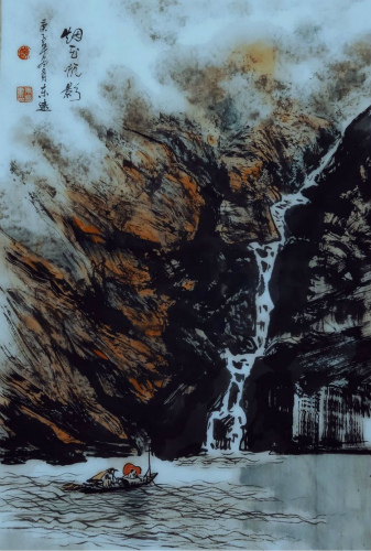 如今,陈东远先生创作的山水画,早已形成自己的风格与个性。画面整体清静旷远、水墨淋漓、灵秀律动。他作画注重笔墨,线条中含有书法底蕴,墨块上显现多层色彩,章法上摆布多样。有的满幅构图,而不沉闷;有的寥寥数笔,别有情趣;有的重彩淡墨,浑然一体。画面富有中国画独有的水墨、水色韵味,尤其是那些虚雾飘渺的云烟、水浪、霞光的呈现,生动而富于韵律,这得益于其运笔的感悟和意境的把握。他的作品,凭借笔墨、点线表现意境,凸显情感和追求。因为有了这种享受,才感到生活充实、自豪。