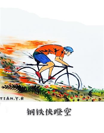 你看到啦,真真切切地看到啦,画面上,这位身着橘红色T恤、埋头用力、风驰电掣的单车手,居然“蹬空”的基本物质条件都没有。我们根本就找不到那个能够踩踏的金属构件,田画家大笔一挥,省略掉了!