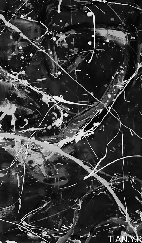 世界上没有什么比漆黑一片更深不可测,也更玄妙异常,而歌剧《黑桃皇后》的故事正是古怪精灵、荒谬离奇,赌徒格尔曼怀着金钱的贪欲“稳赢三张牌”的传奇,以迷恋财富的贪婪开启,以人财两空的悲剧结束。然而,我们可以完全抛开歌剧内容来欣赏抽象油画,画布上的黑色,可以做开放式、多义性的理解,正像散落其间的白色线条和蝌蚪状的音符,可以激发人们的联想与想像,想必不同的人会有不同的感受和感悟。