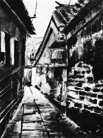 田迎人黑白油画《亲切的小夹道》