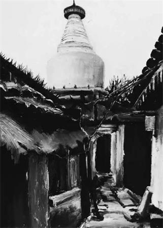 田迎人黑白油画《胡同深处的白塔》