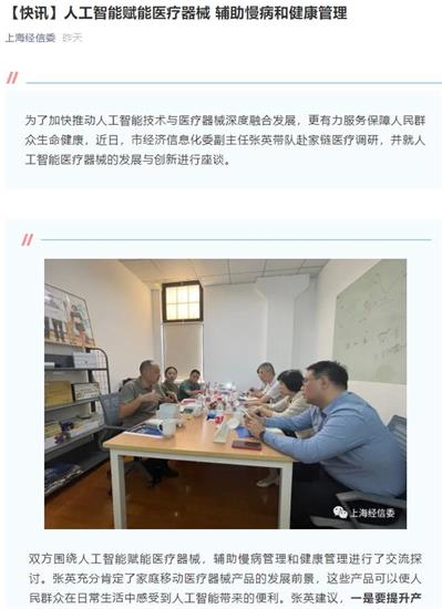 双方围绕人工智能赋能医疗器械,辅助慢病管理和健康管理进行了交流探讨。张英充分肯定了家庭移动医疗器械产品的发展前景,这些产品可以使人民群众在日常生活中感受到人工智能带来的便利。张英建议,一是要提升产品创新能力,规范化品牌化与医院或者其他医疗机构的合作,充分利用医疗资源,提高产品落地价值;二是要强化关键算法研究,在打磨硬件产品质量的同时,通过优质数据积累,强化算法训练,优化健康管理风险监测反馈机制;三是要探索公共医疗数据平台建设,以上海互联网医院系统为依托,链接有关产品数据接口,为患者保存日常健康管理数据,为医生提供更多有价值的数据参考。