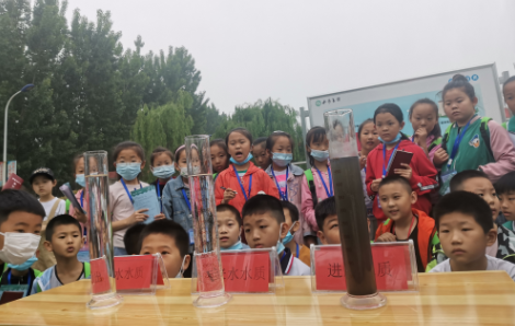 图片注:开展科普教育,将未处理的污水、处理好的污水与自来水进行对比,加深小学生对治污的直观感受。