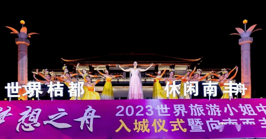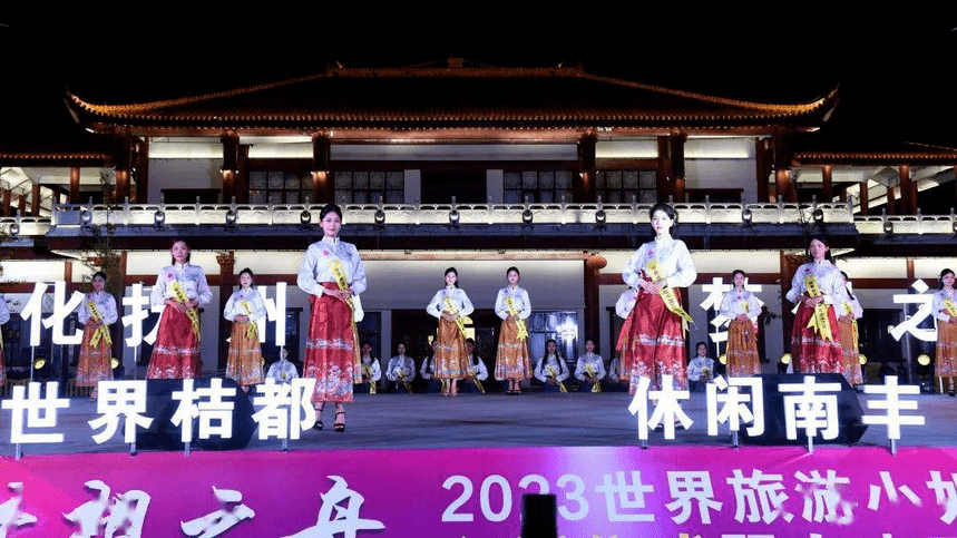 世界旅游小姐进行了集体亮相;与会人员还共同观看了灯光秀、节目表演和南丰产品推介。