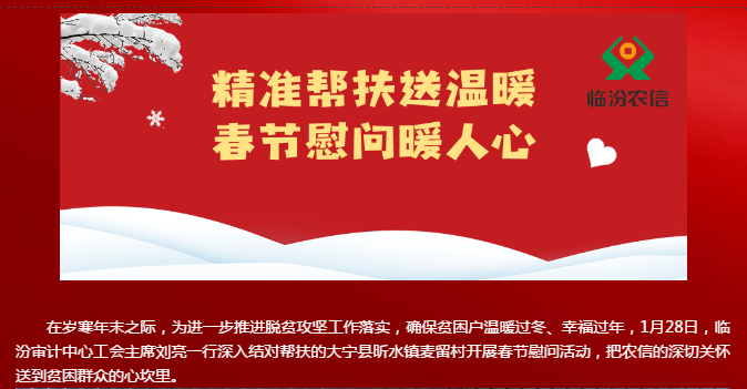 在岁寒年末之际,为进一步推进脱贫攻坚工作落实,确保贫困户温暖过冬、幸福过年,1月28日,临汾审计中心工会主席刘亮一行深入结对帮扶的大宁县昕水镇麦留村开展春节慰问活动,把农信的深切关怀送到贫困群众的心坎里。
