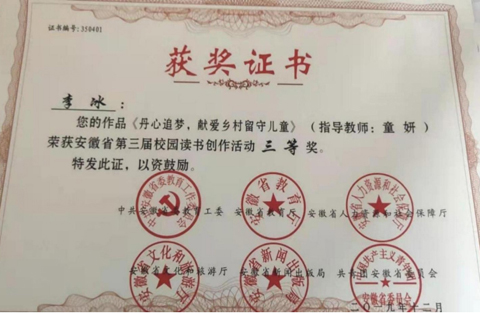 目前为止,李冰同学《丹心追梦献爱乡村留守儿童》荣获安徽省教育厅、团省委、省文化厅等六部门举办“安徽省第三届校园创造活动”三等奖;积极践行大学生志愿服务,参加多期党课学习,被党组织确定为入党积极分子并顺利结业;通过教育本科自学考试全部科目(14科成绩),在大学就读期间实现“双本科”的梦想……