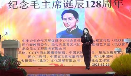 2021年12月26号下午三点钟,在北京市王府井佰膳居信息发布厅,由实力派画家李凤海倡议发起,中小企业合作发展促进中心社会责任服务办公室宣传处指导,民心春晚组委会;、民心志愿者艺术团;敬老助残艺术团主办;北京民心工程服务有限公司承办;丹心社会工作室;大道无为北京文化发展有限公司支持;万欣瑩主持,历时近两个小时的纪念毛泽东诞辰128周年的纪念活动在此隆重举行。