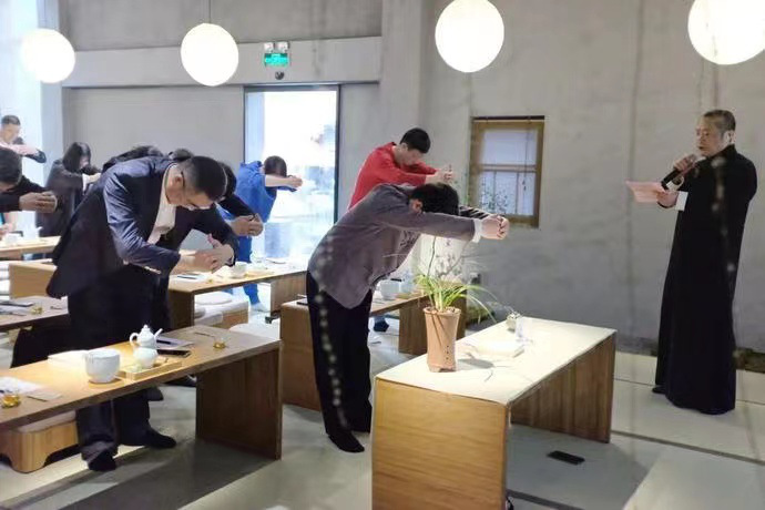 揭牌仪式后,湖南省孔子学会礼乐委员会副主任尹建华引领大家行揖礼,敬先贤。揖礼作为中华礼节,讲究中正安舒,讲求礼敬在心。行礼时,凝神聚气,身体肃立,双手合抱,揽天地入怀,左手在上(女性右手在上),手心向内;俯身推手时,双手缓缓高举齐额(略高过眉心),俯身约60度,起身时,恢复立容。