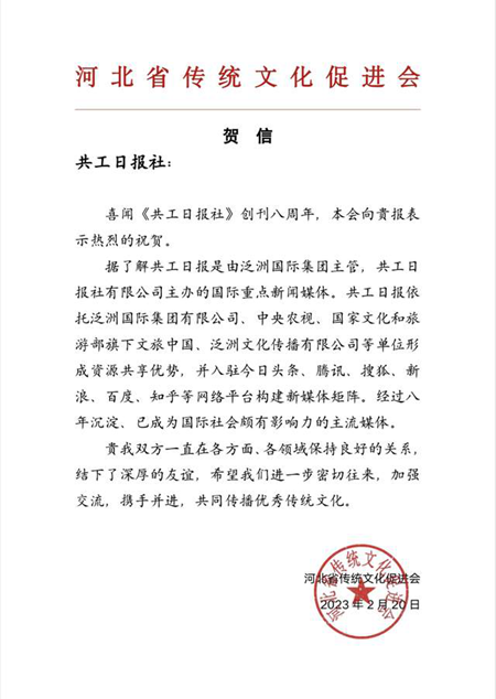 河北省传统文化促进会祝贺共工日报社建社8周年贺信。 贺信截图