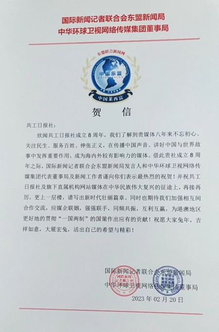 共工日报社香港2月20日电 时值共工日报社建社8周年之际,国际新闻记者联合会东盟新闻局向共工日报社发来贺信。