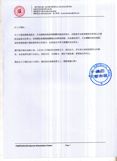 澳门都市报社致信祝贺共工社建社8周年。 贺信截图