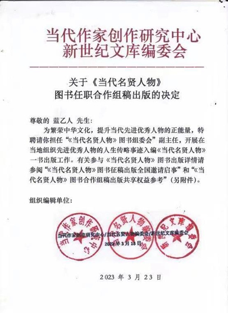 *长期致力于担纲主持“蓝族传媒经济文化联盟”,从事经济文化交流与社会研究,书刊著述与编辑出版,中国蓝族赏识教育实践以及推广,青少年成才研究和潜能开发。先后得到了世界诗人大会副主席雁翼老先生、中华新韵学会会长重阳(《世界学术贡献奖》金奖获得主,《中华新韵》学说创立人,80岁高龄)、中华人民共和国原名誉主席宋庆龄特型演员傅继英、