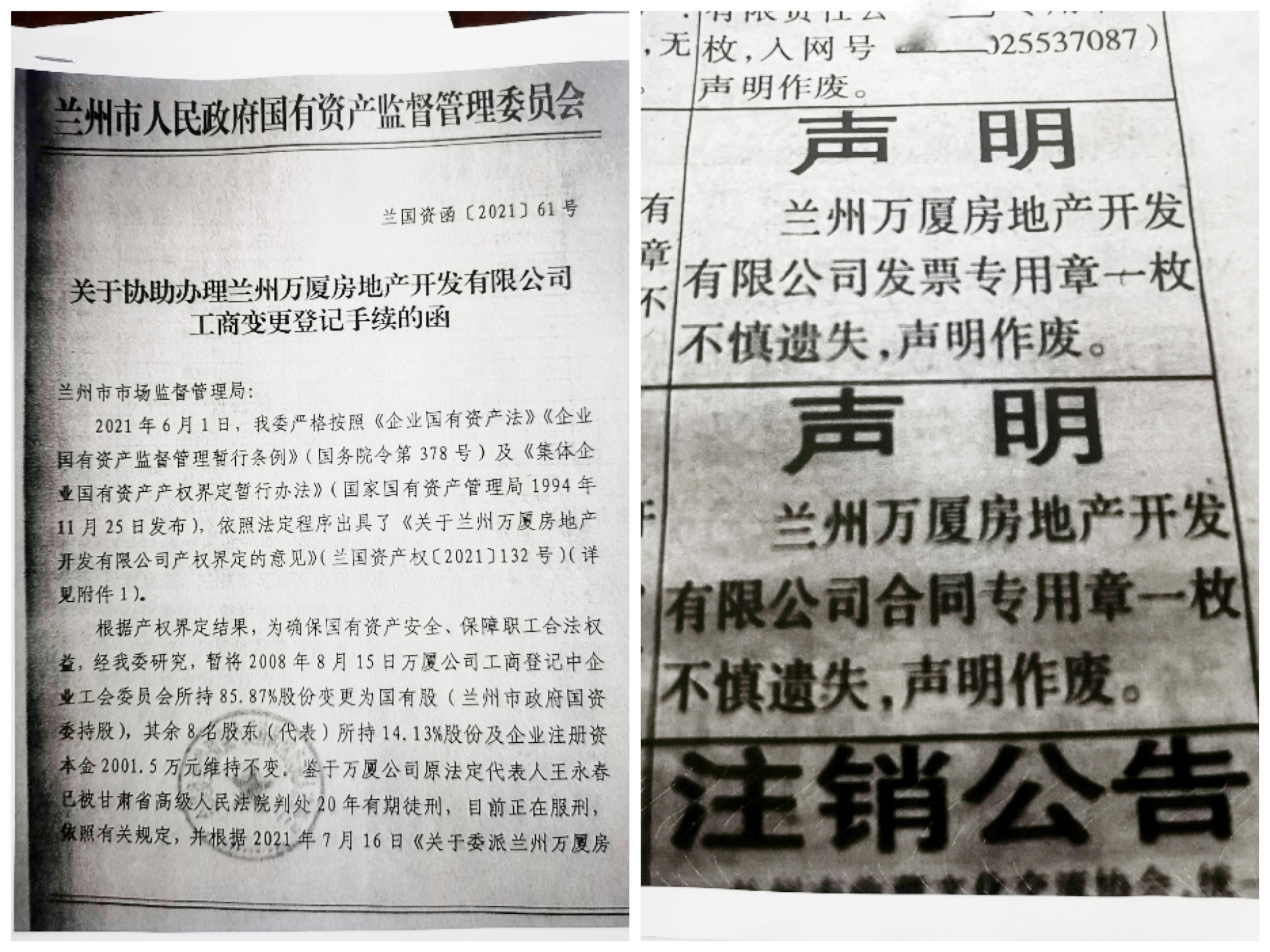 然而, 2021年7月15日,兰州市国资委再次目无法纪,以公函的形式再次指向兰州市市场监督管理局,要求直接变更万厦公司工商登记中企业工会委员会所持85.87%股份。2021年8月,兰州市国资委再次“漠视”甘肃省高级人民法院及兰州铁路运输中级法院的行政判决,连续上演多个戏码,假借企业名义“偷梁换柱”登报挂失公章、合同章不慎遗失,然而公章和合同章均在股东处保存。及“先斩后奏”逼迫其他股东签字,终于在2021年8月5日,成功“非法侵占” 民营企业股权兰州万厦地产开发有限公司85.8706%(简称:万厦地产)及实际控股兰州鑫亿房地产开发有限公司(简称:鑫亿地产),包含企业名下 “鑫亿城”建设项目的14栋大楼23万㎡楼盘的物业权,以及企业名下巨额房产。