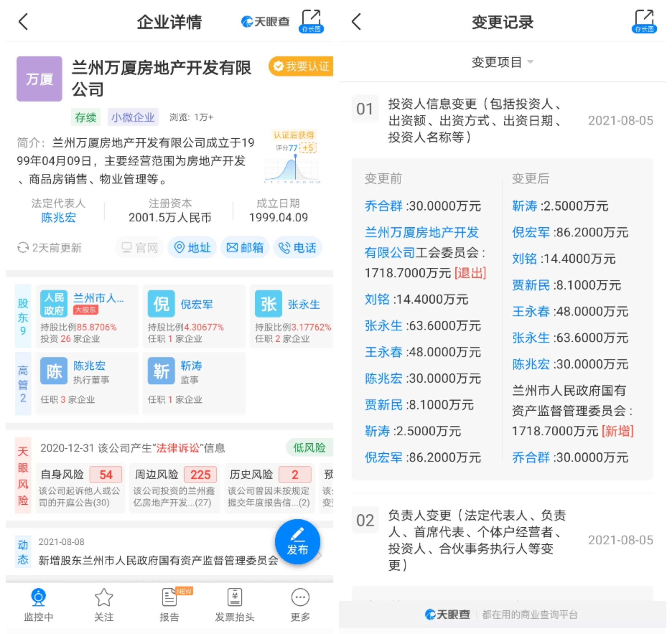 据悉,兰州万厦企业改制后,由 36名职工以现金和买断工龄款入股,持股330股,占85%。并且办理了工商变更登记。据天眼查询,2021年8月5日,违法变更后,兰州万厦房地产开发有限公司股权显示,兰州市国资委侵占股权85.8706%。其中法定代表人更改为陈兆宏,陈兆宏何许人也?如果公司属于国有企业,那么陈兆宏必须是公职人员。知情人士讲述,陈兆宏并非公职人员,而是公司以前的股东,原董事长法人王永春最信任的人。然而,短短几年,王永春进了监狱,他最信任的人摇身一变成了法人和受益人,这里边究竟是否有阴谋?我们也期待专案组能够给公众一个详细的调查报告。