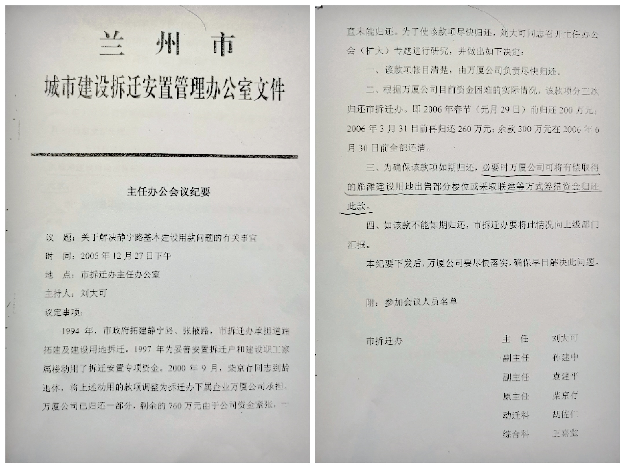 2005年12月27日下午,兰州市城市建设迁拆安置管理办公室文件主任办公会议纪要《关于解决静宁路基本建设用款问题的有关事宜》。议定事项约定,因万厦公司(兰州万厦实业公司已注销)在1997年安置拆迁户和建设职工家属楼借用专项资金剩余760万元因资金紧张未能偿还,要求分三次于2006年6月30日前全部还清。会议纪要特别议定:为确保该款项如期归还,必要时万厦公司可将有偿取得的雁滩建设用地出售部分楼位,或采取联建等方式筹措资金归还此款。