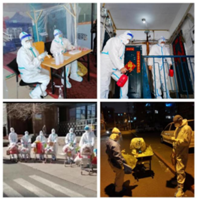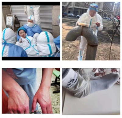 在一线参与志愿服服务的教师们从不言自身苦累,在志愿服务过程中,有的教师脚崴了,绑着绷带继续上;有的教师痛风犯了,一瘸一拐,也决不掉队;有的教师刚做完手术还未痊愈,仍然出现在志愿者队伍中;孩子小没有人看,暂放邻居家;孩子交给老人,夫妻共抗疫;血压高,心脏不好,提前备药;没有交通工具,每天宁可步行三五公里;小区条件不足,他们蹲着吃;工作所需,错过饭时,因低血糖而晕倒,醒来依然是个女汉子;一梯多户的18层高楼,一天下来,脸上的勒痕、耳朵的疼痛、湿透的衣服,不能打消他们抗疫的决心;胶皮手套、酒精喷洒,让他们的手失去了往日的模样,这又何妨;58岁的老党员靳智利老师与85岁的母亲居住在一起,疫情发生后,靳老师主动请缨加入志愿服务队伍,“作为一名老党员,我应该在这个关键时刻挺身而出,发扬党员先锋模范作用,为年轻教师做榜样。”她的母亲也是一名老党员,十分支持女儿奔赴一线,还叮嘱她说:“不用担心,我没问题,能照顾好自己。”
