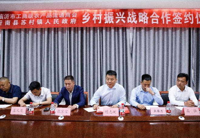 会上临沂市工商联农产品流通商会副会长张京宝代表商会与沂南县苏村镇党委书记高燕妮签订助力乡村战略合作协议。
