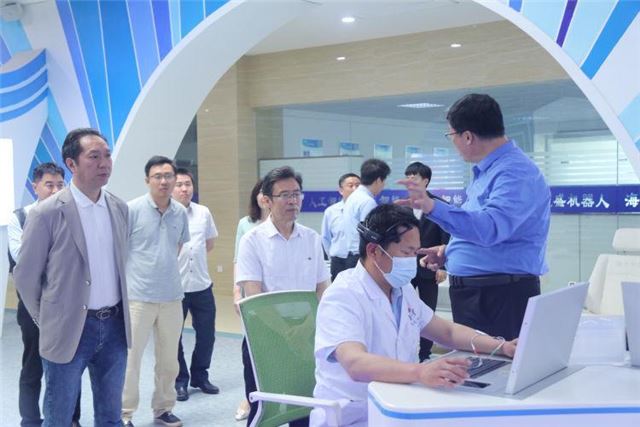 5月18日上午,潍坊市卫健委一级调研员李迎春,中国中药谷董事长、潍坊市浙商联合会会长周方旺团队莅临山东海天智能工程有限公司考察合作,泰安卫健委、产业链陈涛、海天智能总经理张海峰陪同,并共同为中国中药谷海天智能脑机接口设备生产基地揭牌。