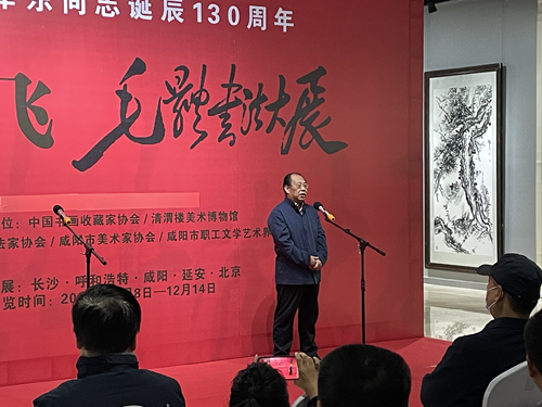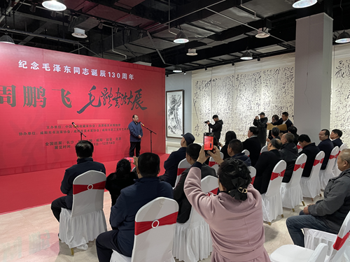 为了弘扬展示新时代中华优秀传统文化,在陕西省文化和旅游厅、咸阳市文学艺术界联合会支持下,由中国书画收藏家协会、清渭楼美术博物馆主办,咸阳市书法家协会、咸阳市美术家协会、咸阳市职工文学艺术界联合会协办的“纪念毛泽东同志诞辰130周年——周鹏飞毛体书法大展”于12月8日在陕西清渭楼美术博物馆隆重举行。