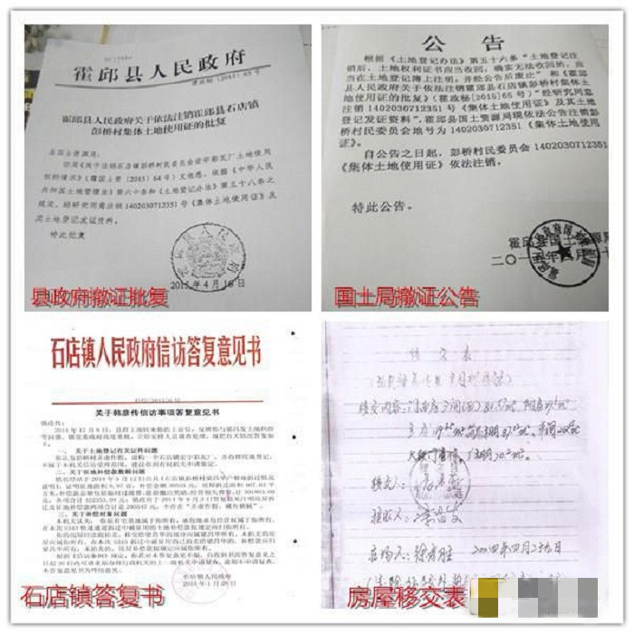 令人更加不可思议的是:在2013年霍邱县S343霍陈路改建工程中,韩彦传家庭上述位于路北、路南的土地被占用,但土地赔偿款却被梁昌华凭借虚假的建设用地使用证领取,韩彦传为此进行了信访维权。石店镇政府2015年给韩彦传出具的“石信【2015】6号《关于韩彦传信访事项答复书》中明确答复韩彦传,“本机关认为;你原有宅基地属于你所有,承包地承包经营权属于你所有,………”