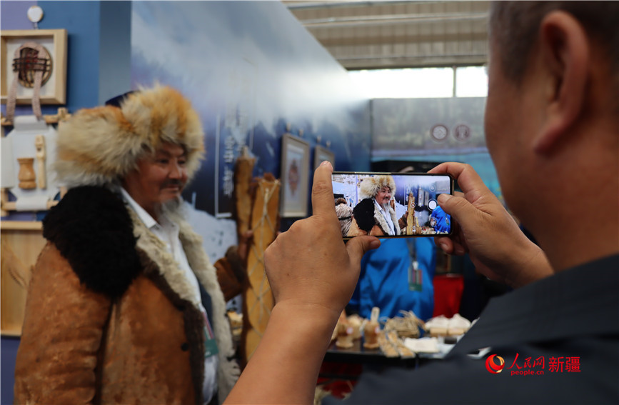 观众拍摄阿勒泰展位现场展示的皮毛滑雪。人民网 李龙摄