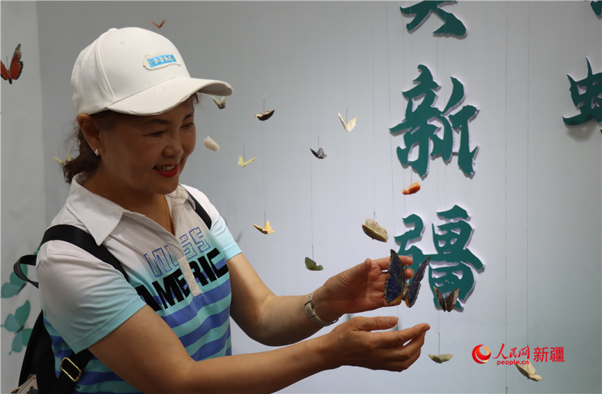 在浙江展馆,观众正在欣赏用各种玉石制作的蝴蝶。人民网 李龙摄