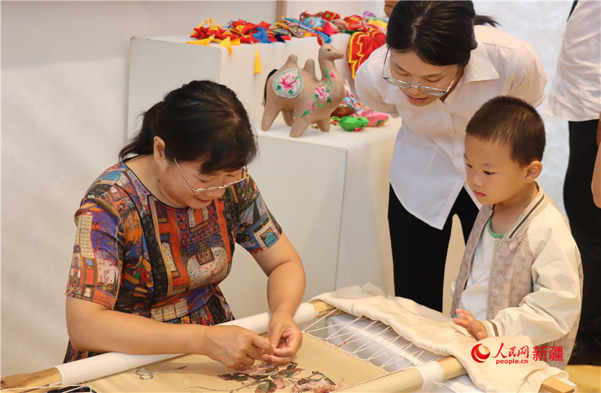 观众认真欣赏刺绣技艺。人民网 李龙摄