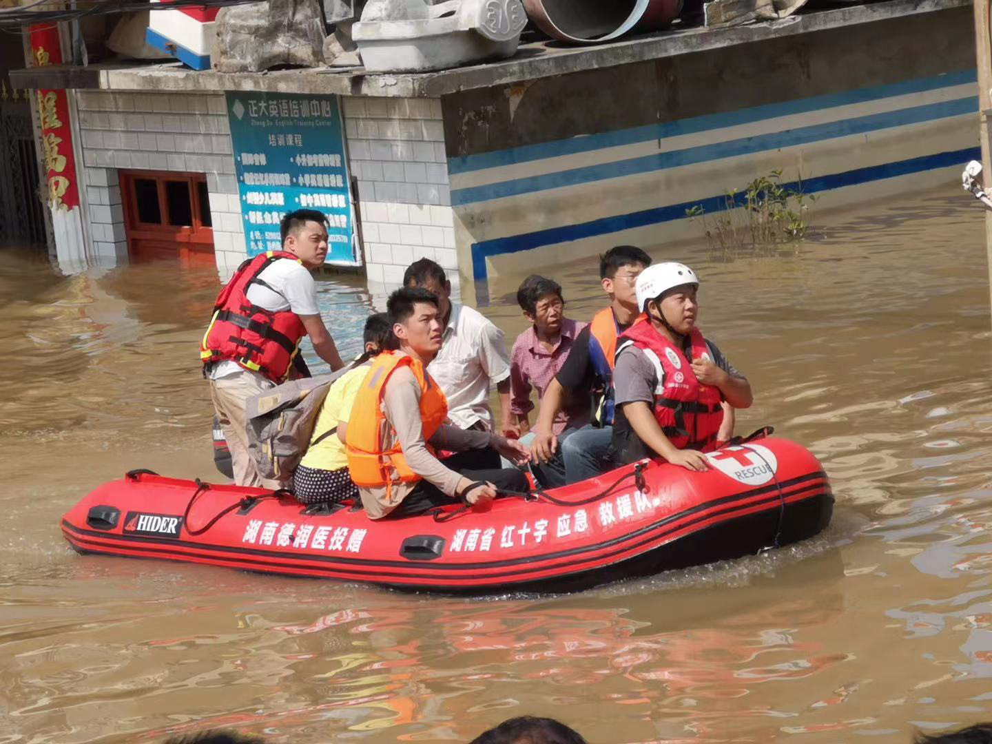 在河南汛情危急时,湖南省红十字会救援队紧急调集全省抗洪抢险志愿者力量,组建了三个梯队,于7月21日、7月23日、7月26日先后从长沙出发奔赴河南参加抗洪抢险。