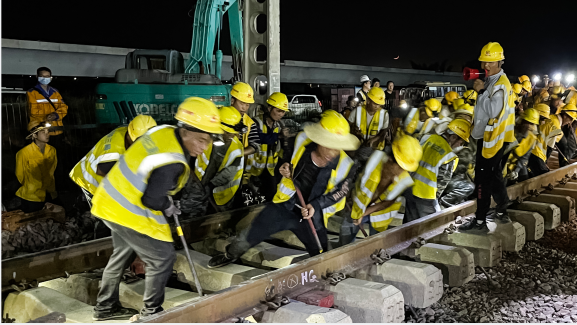 “为了更好完成此次拨接任务,项目部做了充足的准备,提前与各施工配合单位做好沟通工作,不断改进施工方案,根据施工要求调配资源,备足施工物料,做好进场人员安全技术培训和机械设备检验。”项目经理王志军讲到。夜晚的红河州内星光璀璨,道路两旁的霓虹灯闪烁着醉人的朦胧,而在不远处的红河站内则是灯火通明,今晚,这些常年奋战在祖国山川间的筑路人又要进行一次无眠的征战,施工负责人李东伟严肃的表情凝固了空气的流动,22点10分,他手里紧紧握着的对讲机传来了讯息。“施工时间点已下,既有线两端封锁完毕,可以进入施工,时间...”驻站联络员还在不紧不慢地报着,这边听到可以施工的命令,李东伟一声令下,近百人涌进了各自的施工点位,施工的通道是非常狭窄的,若组织不好很容易造成事故,伴随着一声声洪亮的口令,锯开既有线钢轨、清理道砟、起拨道机开始拨轨,拨接线路的步骤一步步有序向前推进,23点30分,昆玉河既有线与工程线临时连接完成,经过开远工务段确认,轨道几何尺寸满足进车条件,00点25分,伴随着一声长长的汽笛嘶鸣声,一列载有500米长钢轨的T11长轨列车缓缓驶入工程线,顺利驶入红河站内,看着远去的列车,所有人脸上洋溢着胜利的喜悦,这是百余人夜战2个多小时取得的成绩,列车渐渐消失在车站里,而此次拨接的线路还没有完成,为保证既有线正常运行,还要将昆玉河既有线拨移至原位,李东伟他们还要继续奋战,而此时的夜变得更深了。
