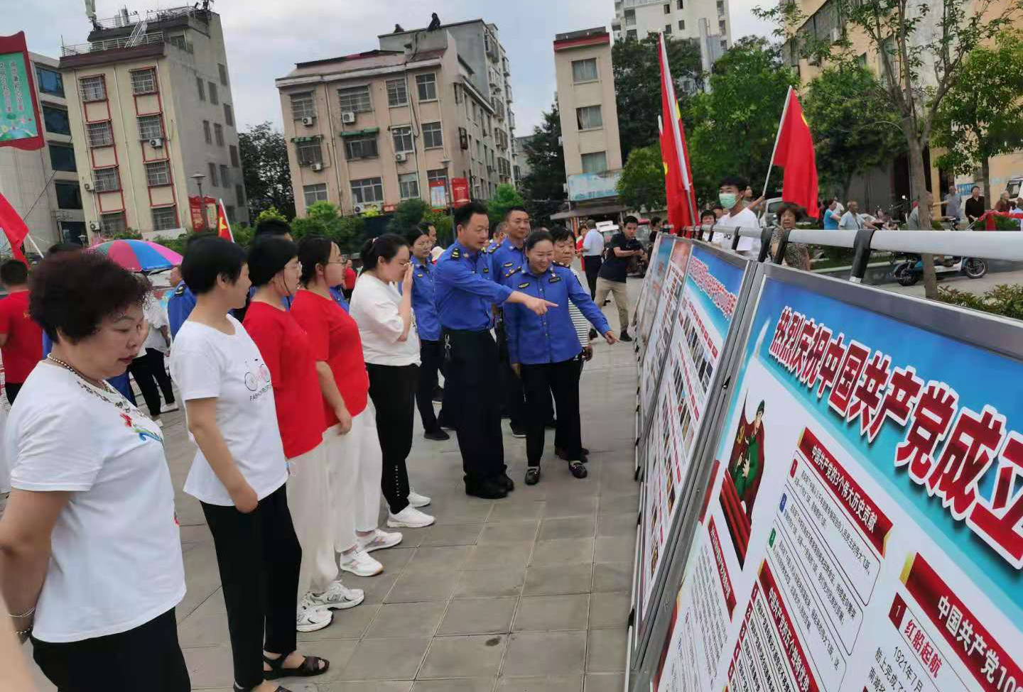 开展赠书仪式上,党史研究室副主任王仁旺向社区两委讲述了禹州农民运动领导者宋聘三的英雄故事 为扎实推进党史学习教育,营造浓厚党建氛围,加强党史宣传力度,打造党建宣传阵地,光明社区党支部及共驻共建单位禹州市不动产登记中心、禹州市城管局、禹州市邮政公司制作党史文化宣传版面30余面在禹州市文庙广场进行展览。宣传版面内容涵盖了党史、党章、习近平新时代中国特色社会主义思想、两会精神、党员权利和义务等,让人既受教育又耳目一新,有效增强了基层党建工作的直观性、教育性和指导性,吸引过往行人纷纷驻足观看,使广大社区党员群众在耳濡目染中增长知识,在潜移默化中了解、支持、参与、融入社区的基层党建工作。社区党员参观完党史宣传版面后,纷纷表示:通过本次活动,认识了中国共产党的百年奋斗历程,了解党的辉煌历史,感悟党的初心使命,激励我们在今后的工作生活中不忘初心,牢记使命,砥砺前行,永记红色精神。