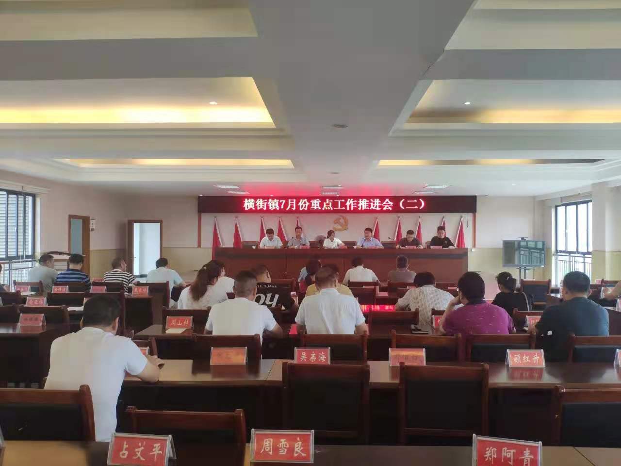 7月28日上午,江西省玉山县横街镇召开7月份重点工作推进会,对当前各项重点工作进行再部署、再强调,细化责任,夯实分工,确保各项工作平稳有序的推进。横街镇党政班子成员、各村(居)支部书记、各站所负责人、驻村干部等共计50余人参加会议。会议由横街镇党委副书记、镇长提名人选周涛主持。