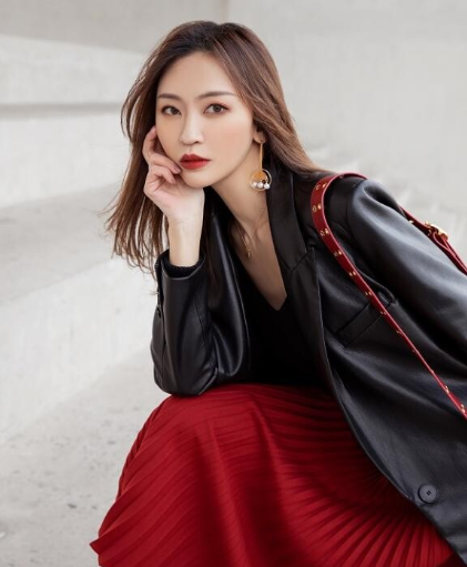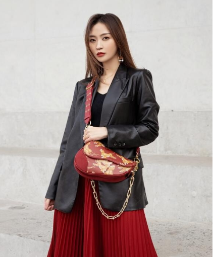 时而优雅时而潮酷,时尚博主全潇潇追求不被定义的人生,做多面的自己。黑与红的经典撞色又酷又撩。全潇潇在面料方面用心选择,以绸质西装,与丝质百褶裙搭配,质感满分,同色系的马鞍包增强时尚感。无论从单品还是整体装扮,全潇潇穿搭中所展现的可复制的潮流元素,是初秋扮靓的不二法宝。