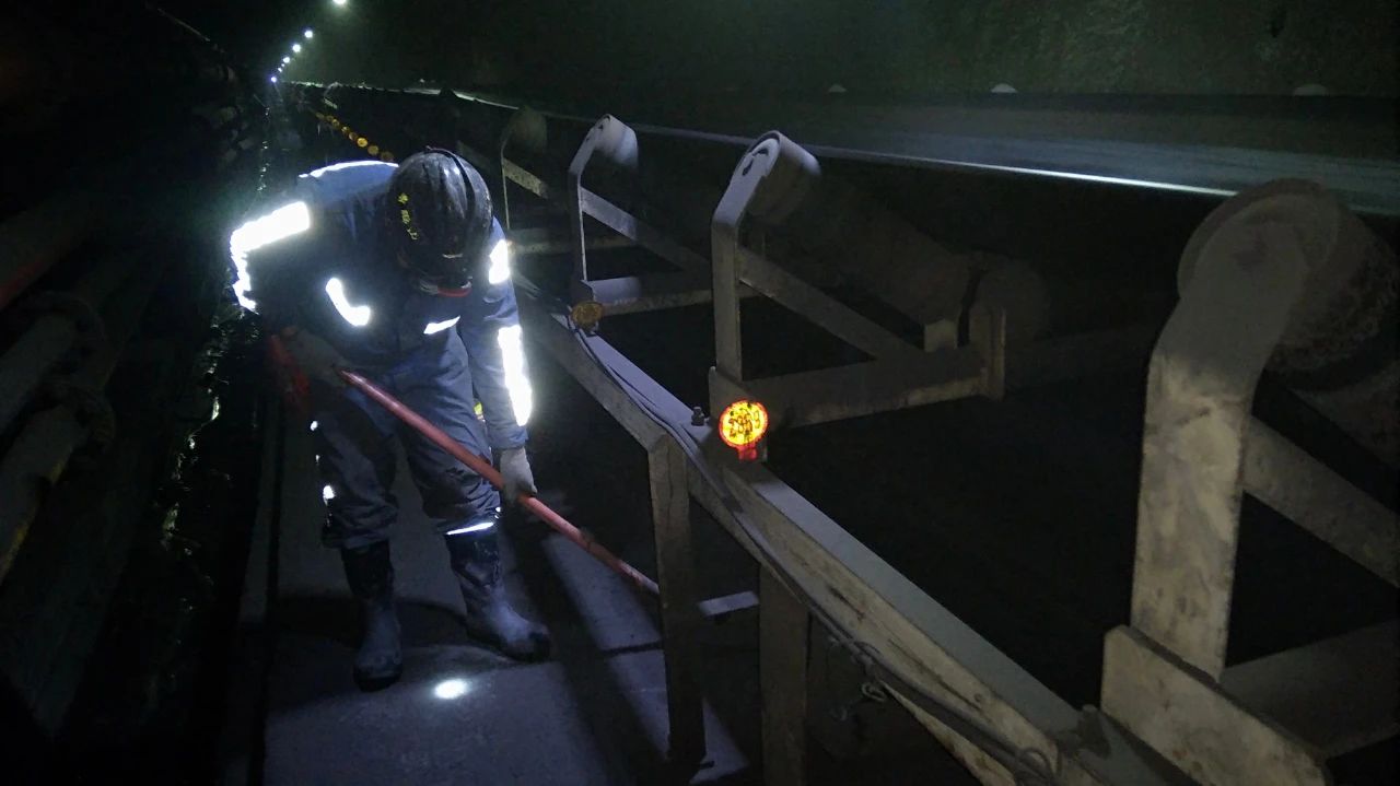 在主斜井巷道听到胶带停车的信号后,随着指挥队干一声令下,早已分布在巷道沿线的干部职工们纷纷行动起来,按照任务量分配,铲的铲,刨的刨,将胶带架下方的浮煤迅速清理到胶带上。手拿纱布和小铲子的职工也跃跃欲试,浮煤刚清理完就开始清理胶带架上附着的煤泥,擦拭编码牌。
