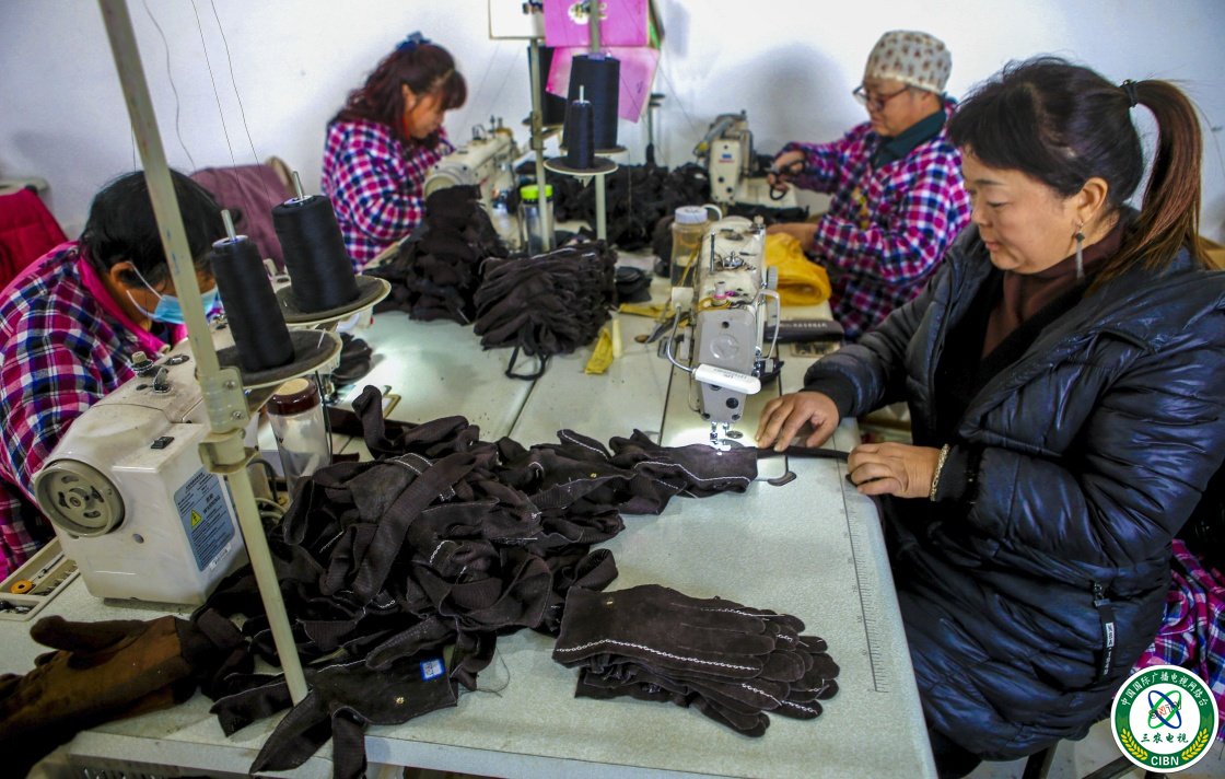 11月27日,饶阳县大官亭镇北歧河村创业就业基地手套加工厂工人在加工手套。