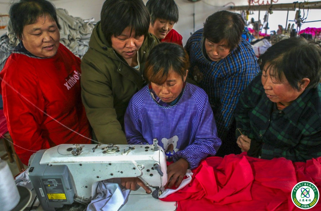 11月27日,饶阳县大官亭镇北歧河村创业就业基地服装加工厂技术人员(左二)对工人进行技术培训。
