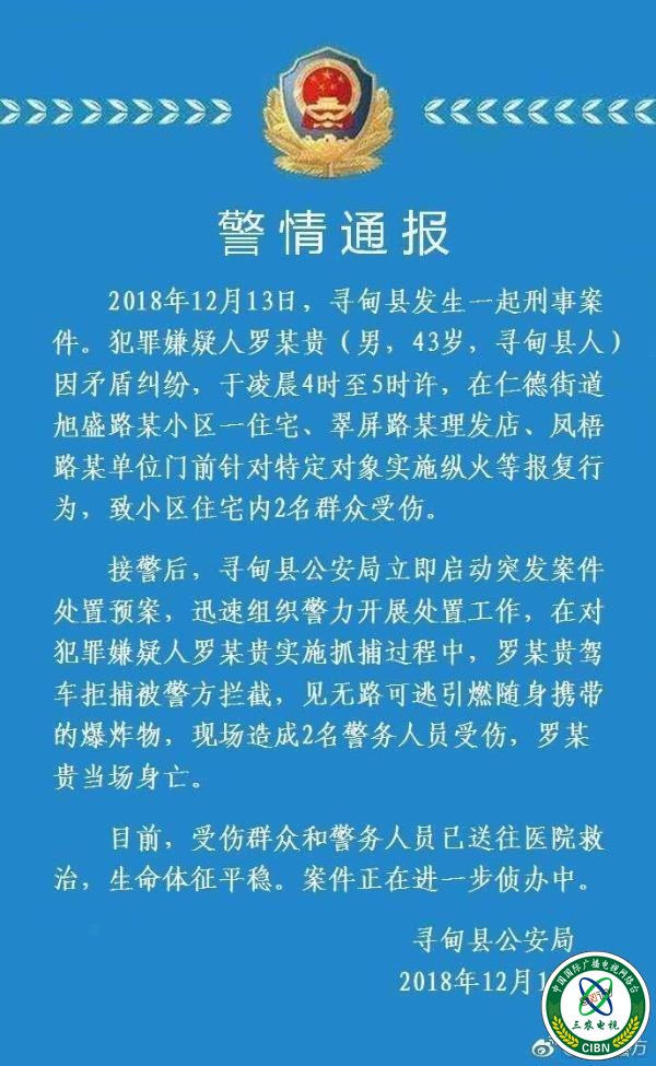 据云南昆明寻甸县公安局微博14日凌晨0时25分通报,12月13日,寻甸县发生一起刑事案件。犯罪嫌疑人罗某贵(男,43岁,寻甸县人)因矛盾纠纷,于凌晨4时至5时许,在仁德街道旭盛路某小区一住宅、翠屏路某理发店、凤梧路某单位门前针对特定对象实施纵火等报复行为,致小区住宅内2名群众受伤。