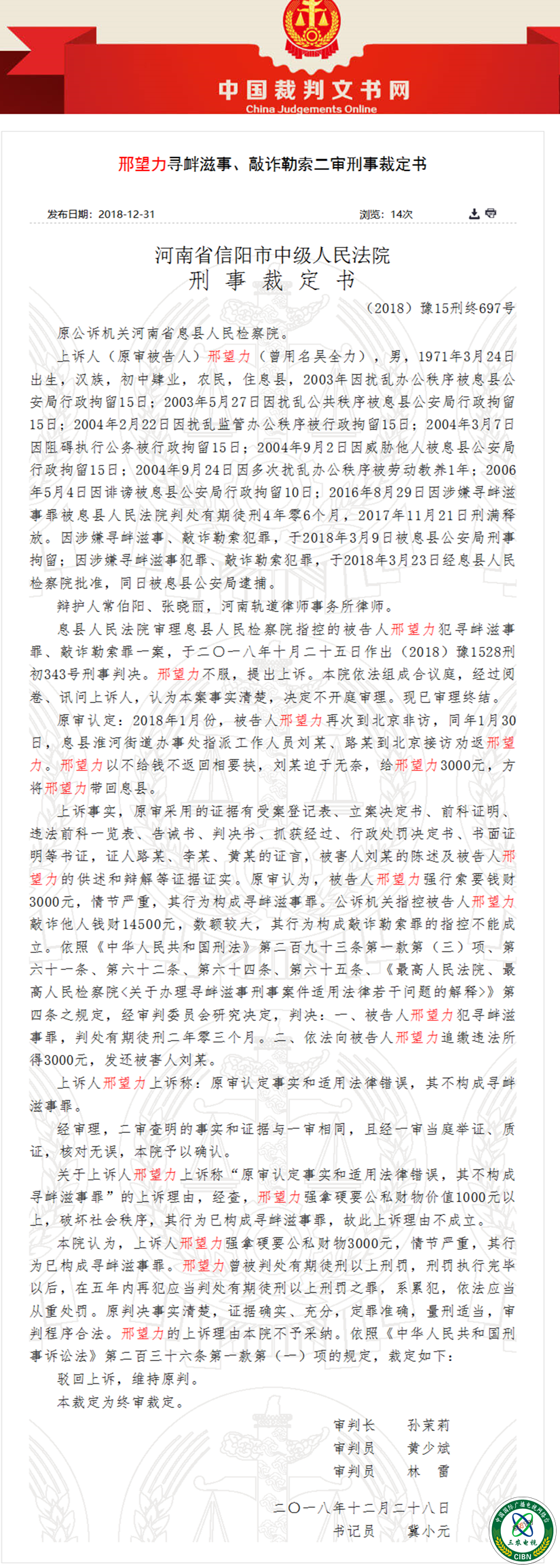 据中国最高法院网站“中国裁判文书网”消息:2018年12月28日,河南省信阳市中级法院下发(2018)豫15刑终697号刑事裁定书,12月31日将该裁定书上传至中国裁判文书网。