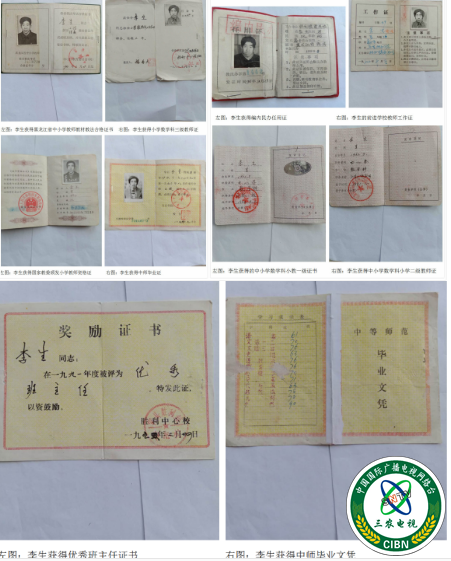 图:优秀民办教师李生获得的各种资格证书及荣誉证书。
